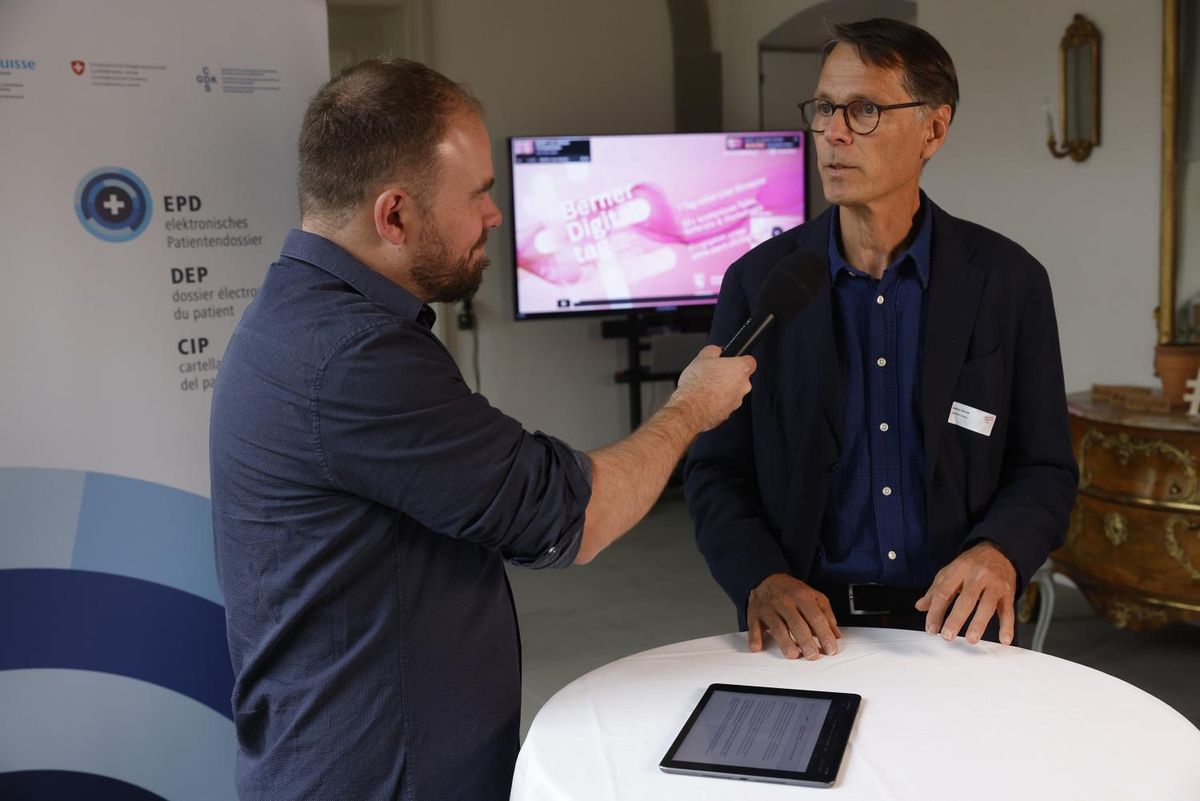 Im Festsaal des Berner Erlacherhofs stellte sich Adrian Schmid, Leiter von eHealth Suisse, den Fragen der Moderation. «Die Einführung des elektronischen Patientendossiers ist ein Generationenprojekt», so Schmid, «der Kulturwandel wird seine Zeit brauchen.»
